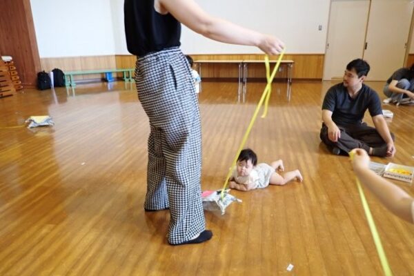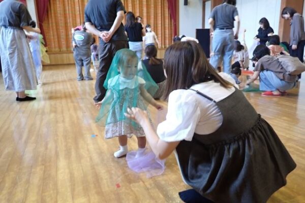 最初に、オーガンジーを使って遊んだり、親子で遊べるわらべ歌を教えて頂いた後、いよいよお待ちかねのリズム運動の時間。