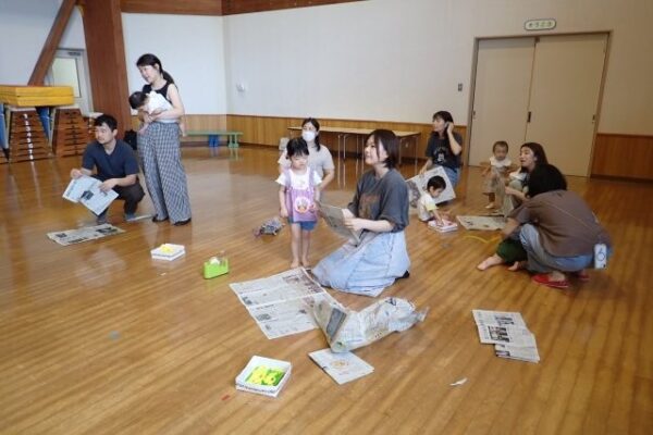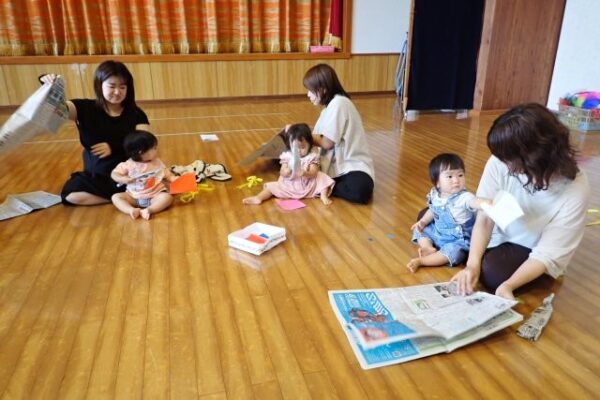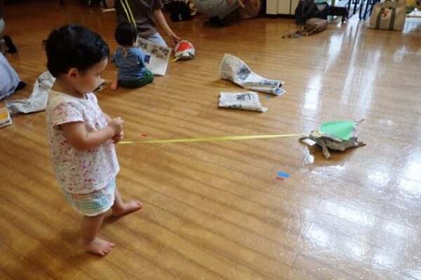 最後には、新聞紙を使って「おさんぽかめさん」を作りました。かめさんとお散歩したり、おうちの方がお散歩しているかめさんを追いかけてみたりしましたよ。