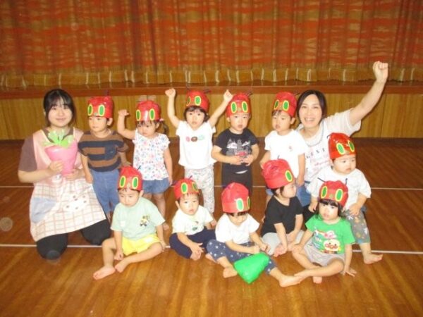 こいぬ組(1歳児)さんは、大好きな絵本の一つである、はらぺこあおむしになっておうちのかたと一緒に競技をします!