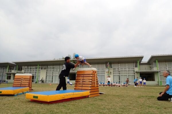 カリキュラムの体操で取り組んでいる足抜き回りや跳び箱の蛙飛びは何度も挑戦し、少しずつできるように!