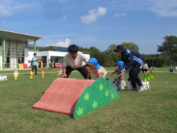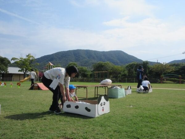 親子競技では、いつも幼稚園で遊んでいる運動遊びをしながら、わんわんバスを運転したり、押したり、バスごっこをしましたよ。