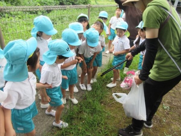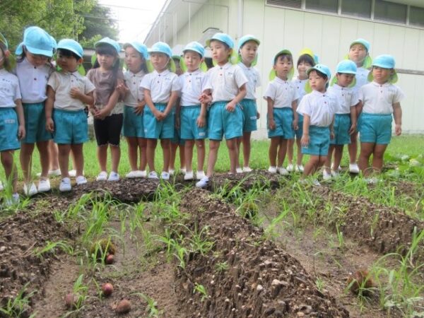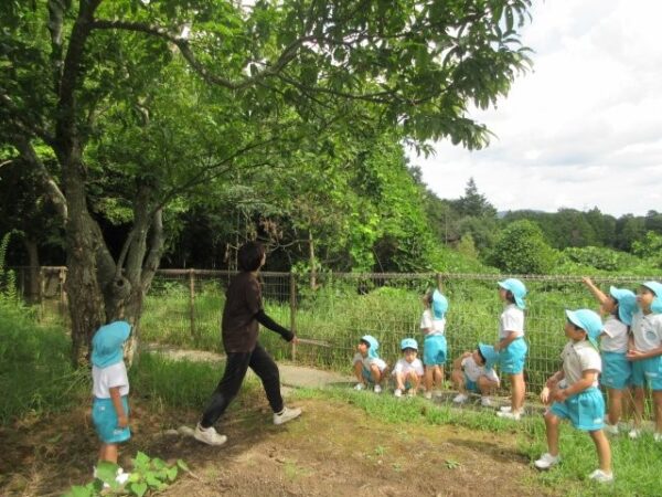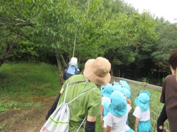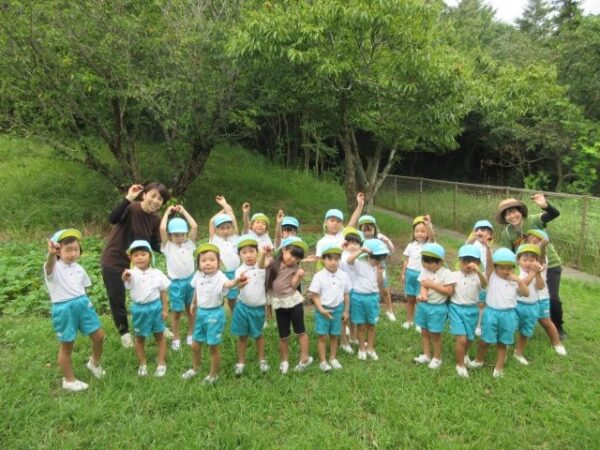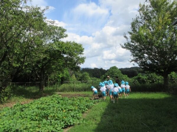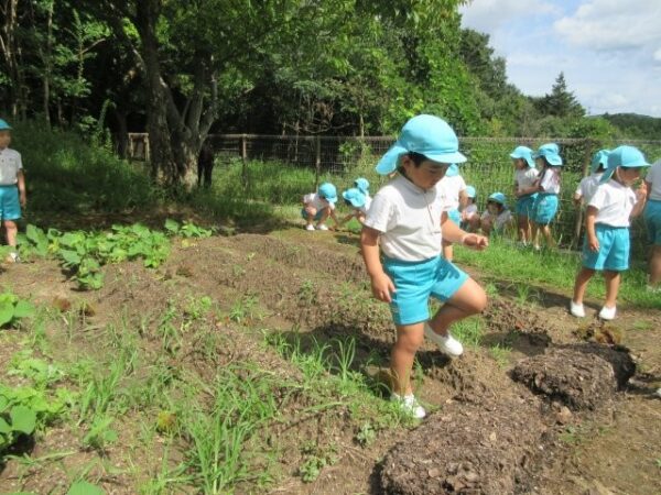 ぼうけんの丘の畑に栗が落ちていることをみつけたさくら組(4歳児)さん。