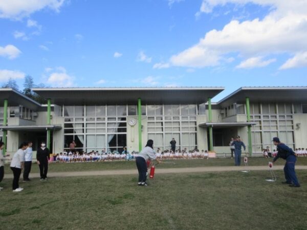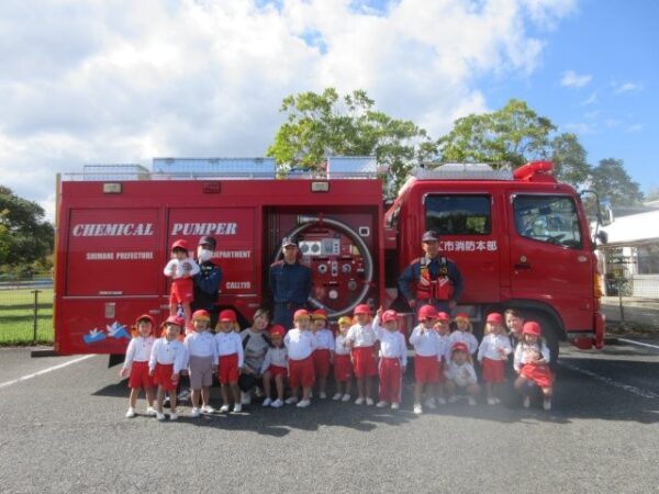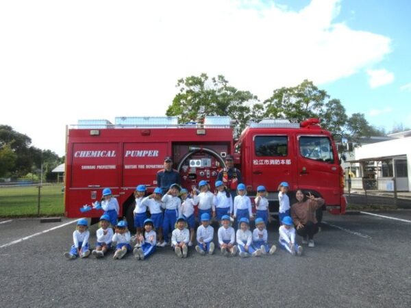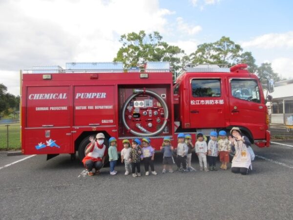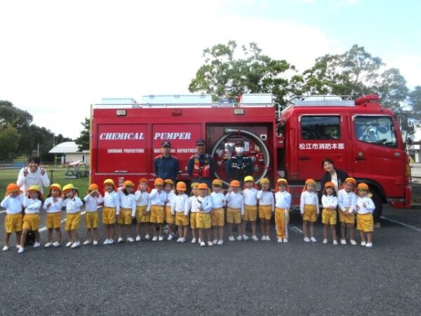 今月は特別に松江北消防署の消防士さんにお越しいただき火災の避難訓練がありました。