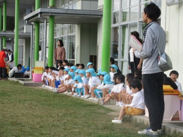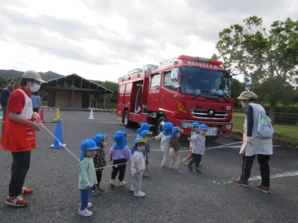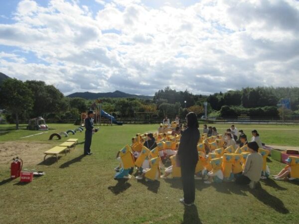 避難訓練の際には、実際に火事が起きたことを想像しながら、静かに先生のお話を聞き避難する子ども達。