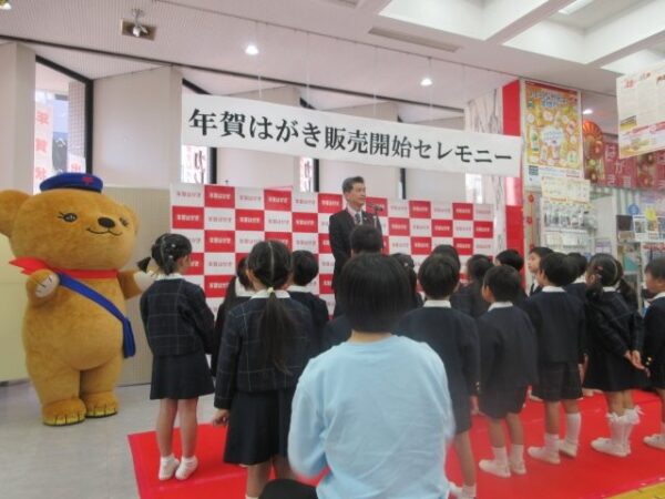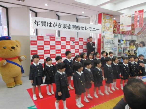 さくら組(4歳児)さんが、松江市中央郵便局で開催された年賀はがき販売開始セレモニーに参加させていただきました。