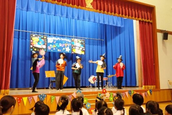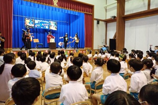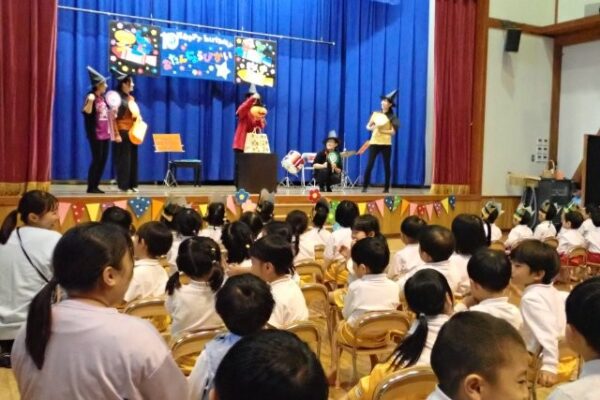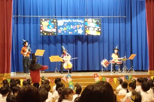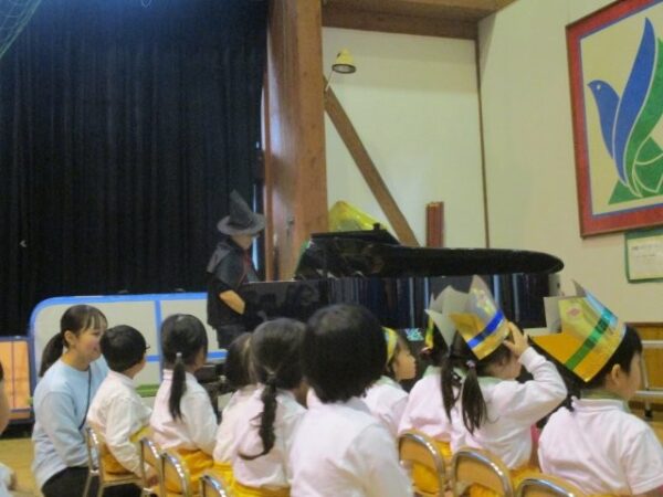 そして、今月のお楽しみは魔法使いの音楽会。5人の魔法使いさんが幼稚園に遊びに来てくれて、音楽会が開かれました。
