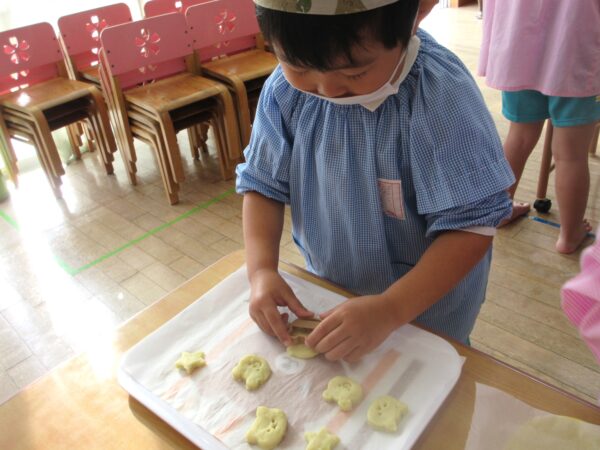 自分で星の形を作ったお友達やサッカーをしている姿の形、お刺身の形、お花の形などクッキー型以外にも子ども達が思い思いの形を想像を膨らませながら作ることもできましたよ。