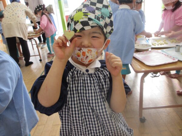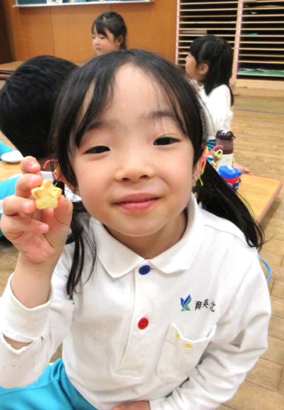 クッキー作りを通して、お友達と協力して作ろうという気持ちや芋掘りからクッキーに変化し、食べ物が口に入るまでの過程を楽しみながらクッキングをしたさくら組さん。これらの経験を今後も様々な食育活動へと繋げていきたいと思います。