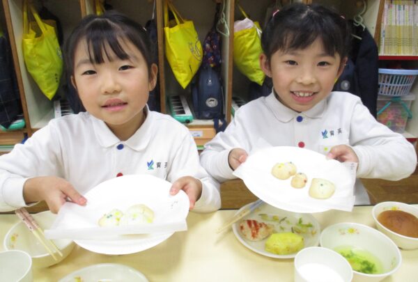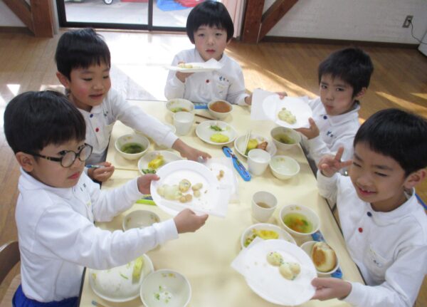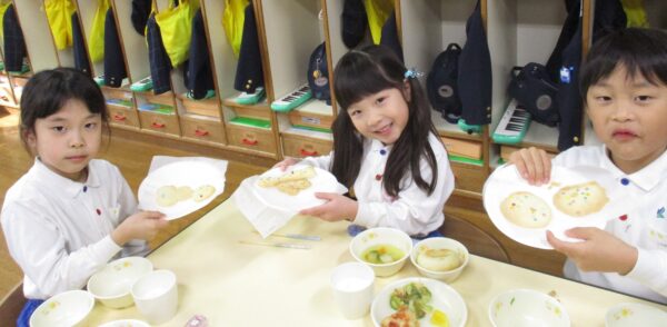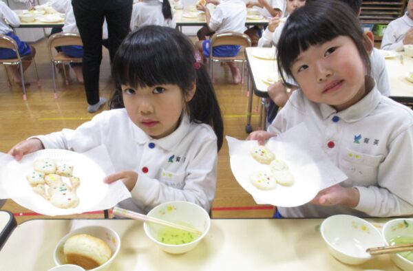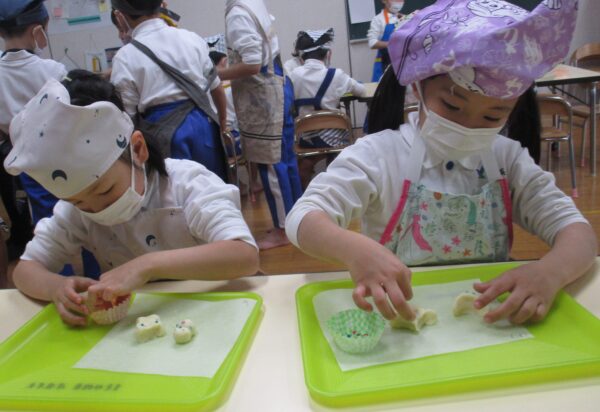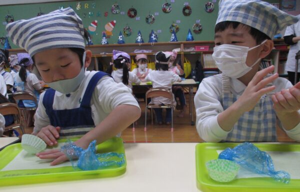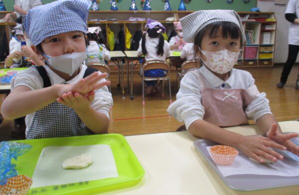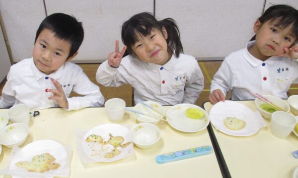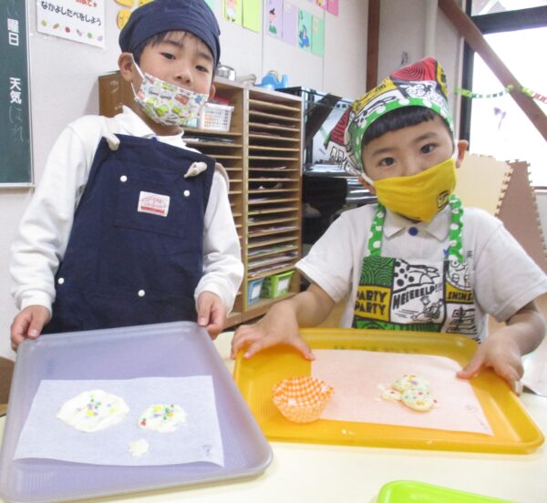 「雪だるまにしよ~」・「恐竜にしよう」などと自分の作りたい形を想像し、アラザンなどのトッピングでかわいく飾りつけしました。中には、「丸くすると焼いたときに崩れるかもしれないからペチャンコの雪だるまにしたよ」とお話をするお友だちもいました。出来上がりを想像しながら作る姿に驚きました。焼きあがったクッキーは給食時に美味しくいただきましたよ。「焼いたのに茶色ではなく白いクッキーで雪だるまそっくりだね」と会話も弾んでいました。これからもいろいろなことに気付いたり想像しながら卒園までにまたクッキング活動を行っていきたいです。