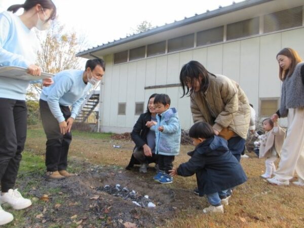 おうちの方と慎重に焚火に近づき、無事にお芋を入れれた後は、「焚火ってあたたかいんだね」とおうちの方とお話しながら嬉しそうなお友達でしたよ。