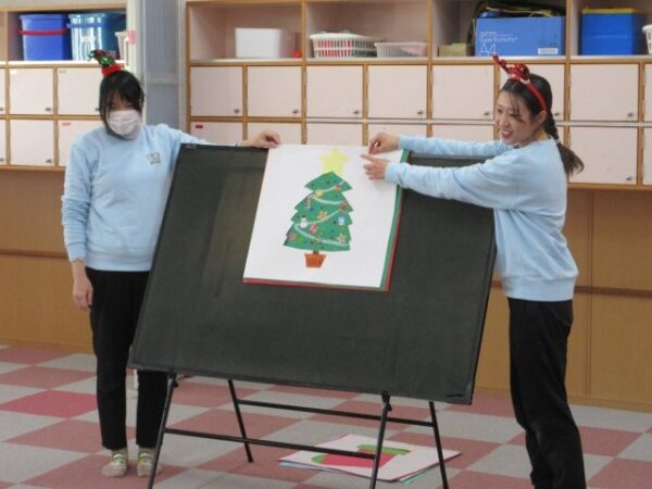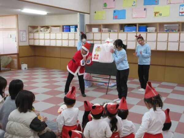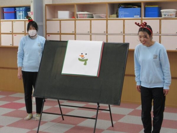 「これなーに?」という先生の質問に、「ゆきだるま~!」と教えてくれるこあら組さんと、でてきた絵に“わ~”と目をきらきらさせるこりす組さん、こいぬ組さん。最後には、サンタさんが本物のプレゼントを持ってきてくれましたよ。とても、嬉しそうな子どもたちでしたよ。