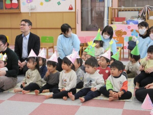 遊戯室に集まって、お誕生日のお友達のお祝いをしました。