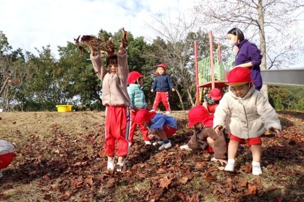 ぼうけんの丘の上では、落ち葉もたくさん見つけて、「みてみて~!」ときれいな落ち葉を先生に見せてくれたり、みんなで落ち葉シャワーをしたりしましたよ。