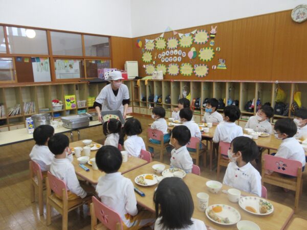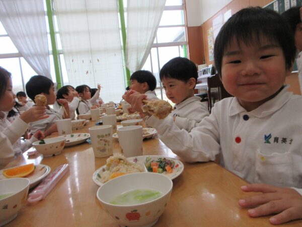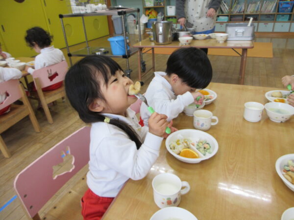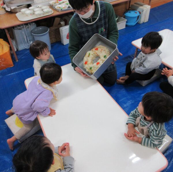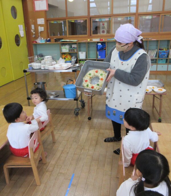 いただきますの前に「今日は何の日~?」と聞くとみんな口を揃えて「クリスマス!」と教えてくれました(^▽^)中には「昨日ケーキ食べたよ!」「お家で美味しいごはん沢山食べたんだよ!」と嬉しそうに教えてくれるお友達もいましたよ!