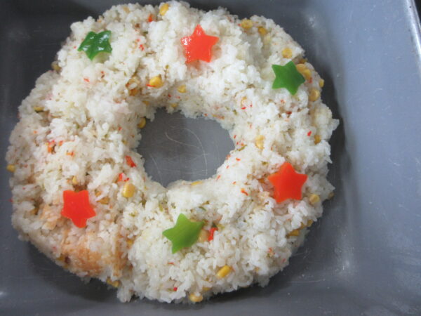 給食の先生達で子ども達に少しでも楽しんでもらえるようにクリスマスピラフでツリーの形を作り完成です♪