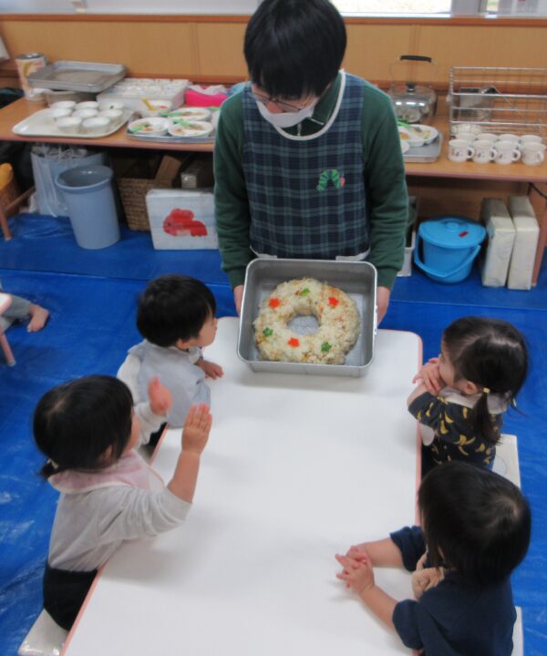 そしてご飯食缶の中に盛り付けたピラフで作ったツリーを見ると「ツリーだ!」「美味しそう~!」「早く食べたいね!」と目をキラキラ輝かせていました☆
