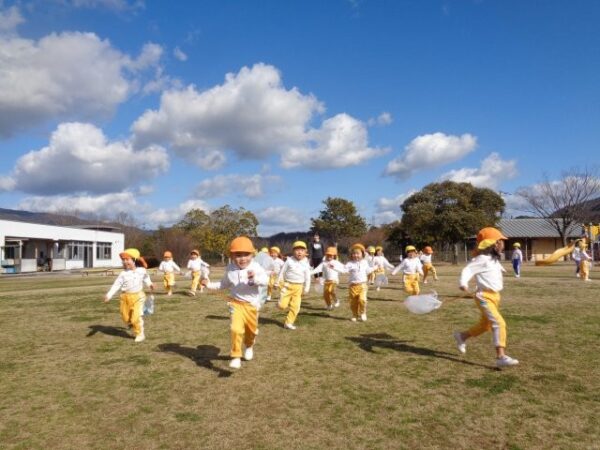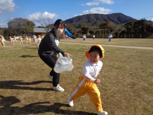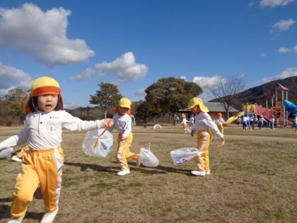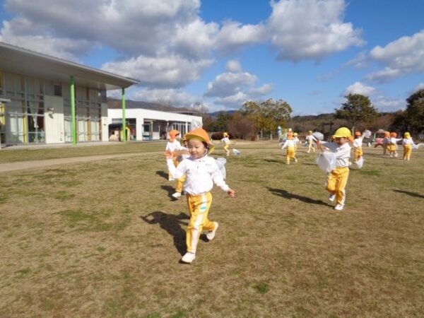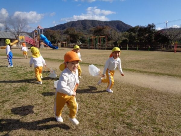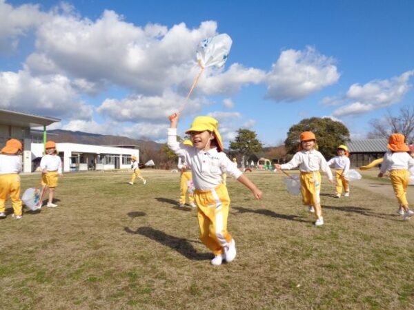 風になびいて飛んでいく凧に「わ~!」と目を輝かせながら園庭をぐるぐる回ったり、「わたしについてきて!」とお友達と一緒に駆け巡ったり。