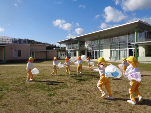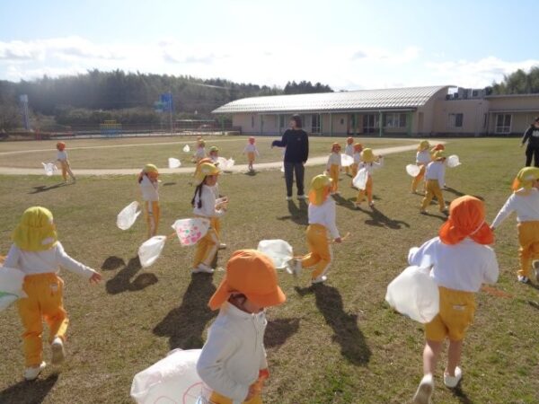 ぱんだ組(3歳児)さんはビニール袋に絵を描いて作った凧を使って凧揚げをしましたよ。