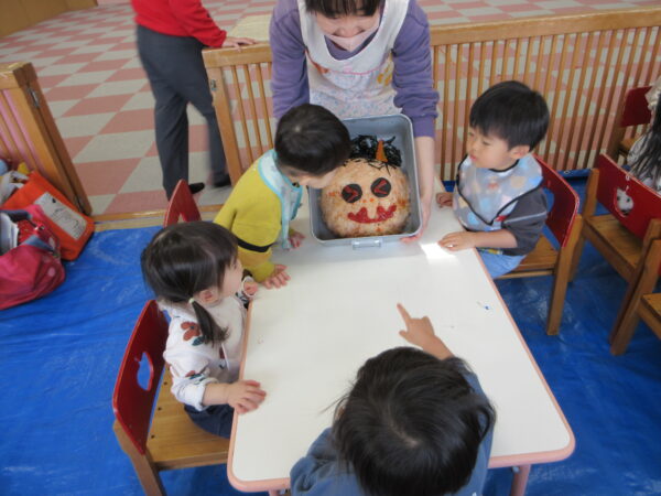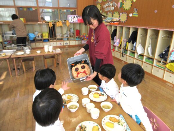 出来上がったおにごはんをこりす組さんへ見せに行くと、「こわい…」と涙が出る子ども達がいました。ご飯で作った鬼でも恐かったようでした。