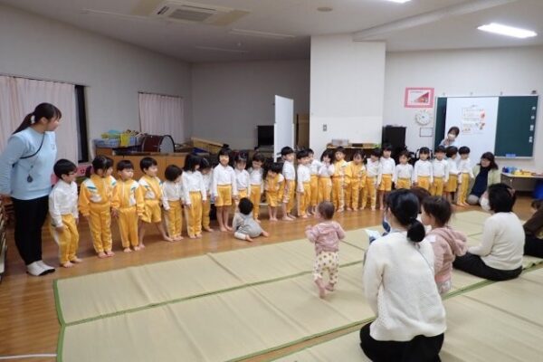 まずは朝の会。今月はうさぎ組(3歳児)さんと一緒に朝のお歌や今月の歌、ご挨拶をしましたよ。
