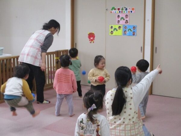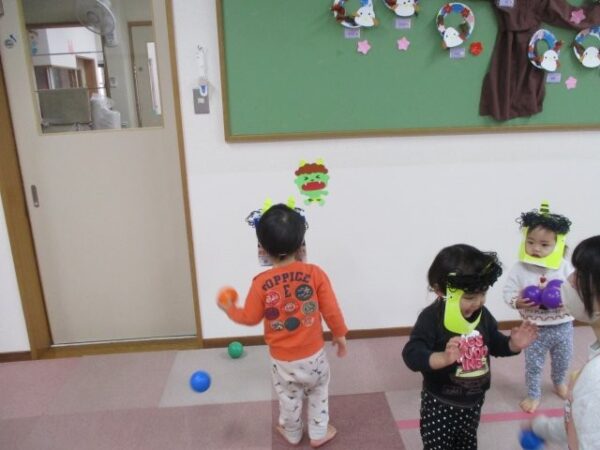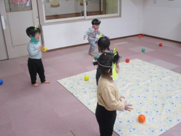 手作りの鬼のお面を付けて鬼になりきって遊んだり、小さな鬼さんをカラーボールで鬼退治をしたりしましたよ。