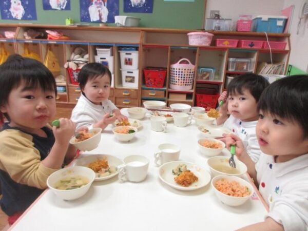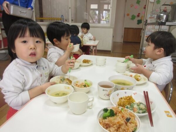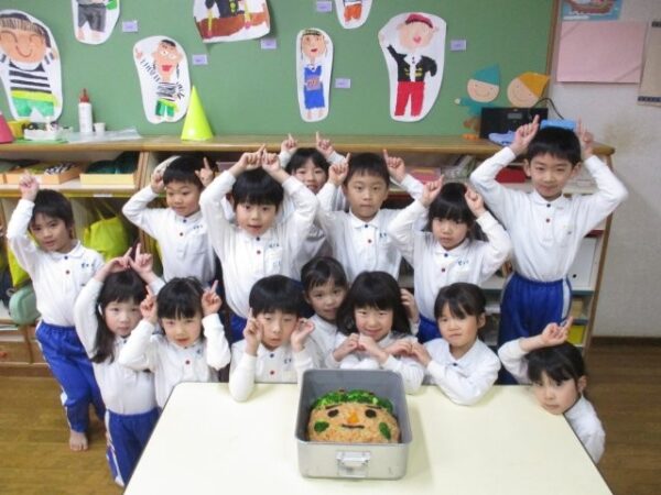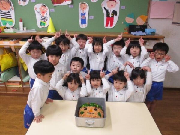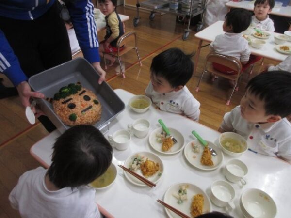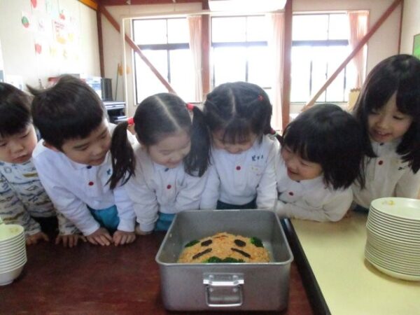 鬼ご飯(ケチャップライス)を見るとわくわく嬉しそうな子どもたち。