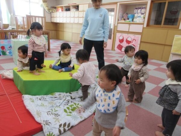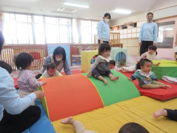 こりす組(0歳児)さんのお部屋では「運動遊び」。