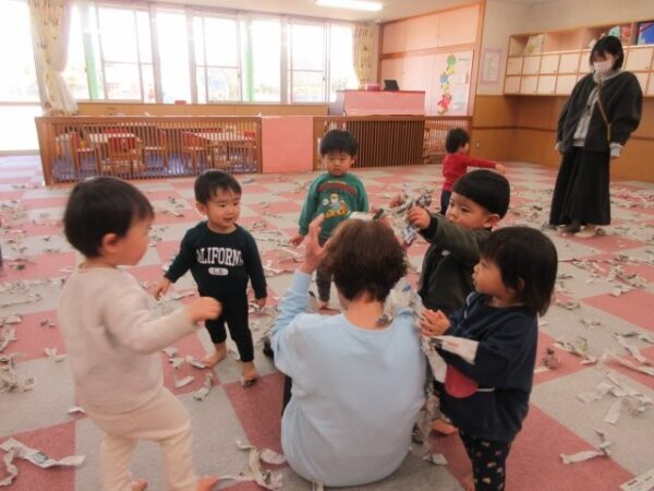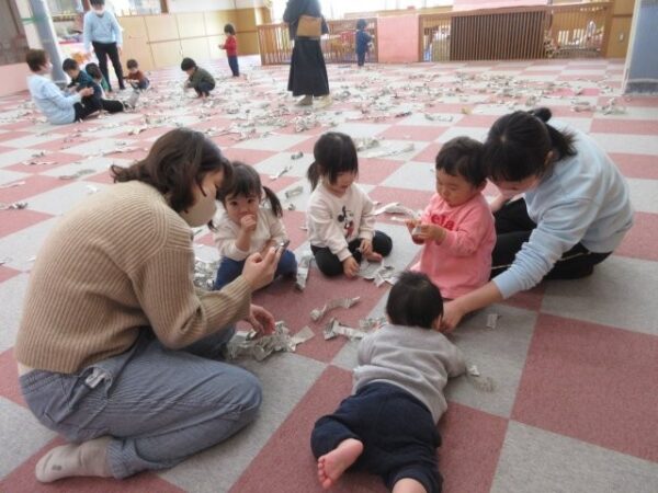 こいぬ組(1歳児)さんのお部屋では「新聞紙遊び」。