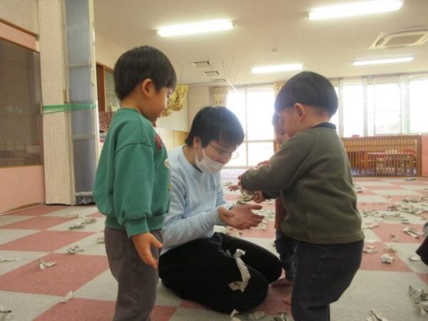 新聞紙をちぎってみたり、ちぎった新聞紙を使って新聞紙シャワーをしてみたり色々な遊びをしましたよ。