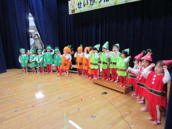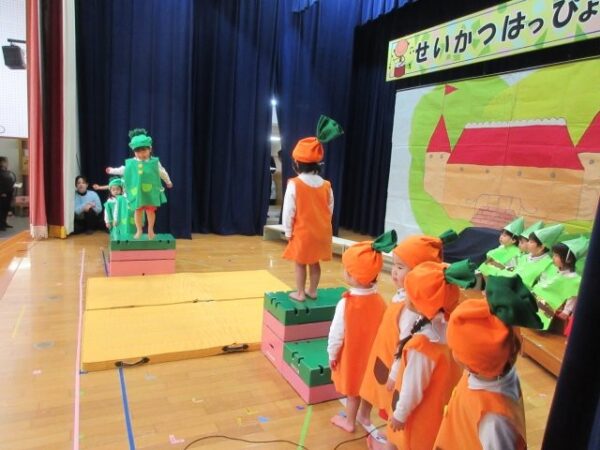 劇では、「やさいのパーティーおおさわぎ」に挑戦。手遊び歌、巧技台からのジャンプ、それぞれの得意なことを披露しながら、やさいさんたちになりきり楽しそうなこあら組さんでしたよ。