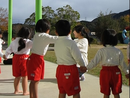 歌では「♪たぬきのたいこ」というたぬきさんが出てくる歌も歌い、テラスに出て幼稚園の近くの山に向かい「たぬきさんに こえがとどくかな~?」と歌う姿もありましたよ。