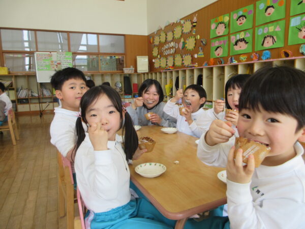 オーブンで焼いたカップケーキを見て「わあ!いい匂い!」「早く食べたい!」と自分たちで作ったカップケーキに喜びがあふれるさくら組さん。